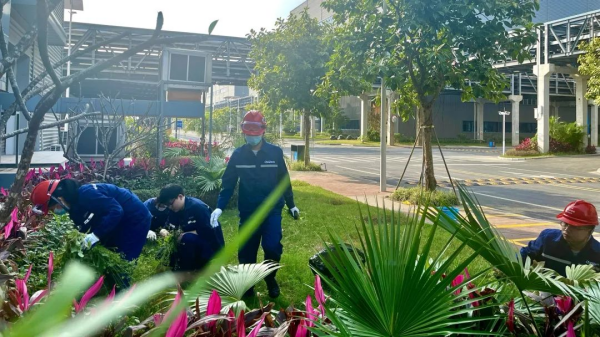 欽州產業基地200名員工齊聚基地辦公樓旁,大家按部門分成小組,在小組長的帶領下,開展了植樹及為綠植澆水活動,倡議全員爭當綠色低碳踐行者。