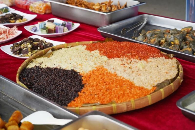 伴隨著此起彼伏、高遏行云的歌聲,另一邊的長(zhǎng)桌美食盛宴也拉開(kāi)帷幕,有象征吉祥如意、五谷豐登的五色糯米飯;有清香四溢、滿口香甜的各色水果;有清甜軟糯、蘊(yùn)含著壯族人民對(duì)美好生活向往的粽子;還有各式各樣、滿口留香的面點(diǎn)......食材豐富,色香味俱佳,把壯鄉(xiāng)民俗特色展現(xiàn)得淋漓盡致。