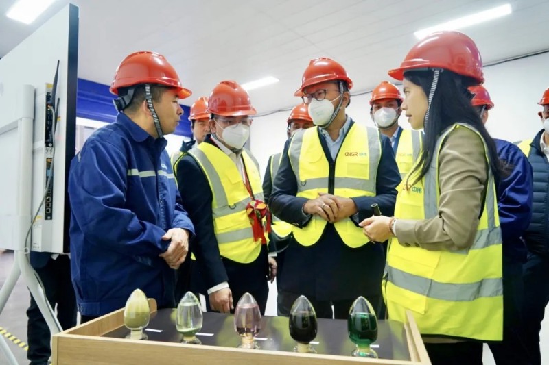 工作人員向部長一行展示了高倍率的中偉產品電鏡圖,Rosan Perkasa Roeslani部長在近距離觀看由印尼鎳資源生產的高性能新能源材料后,對中偉快速開發與量產的技術服務能力及產業化應用能力表示贊嘆。