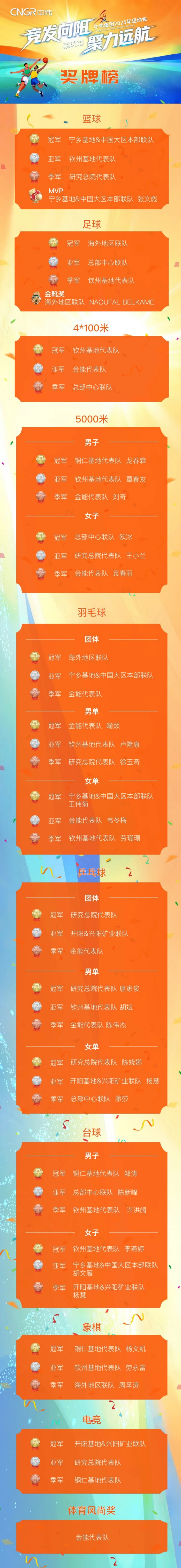 每個(gè)代表隊(duì)都收獲了屬于自己的榮譽(yù),有時(shí)隔一年再度重奪籃球冠軍的寧鄉(xiāng)基地&中國(guó)大區(qū)本部聯(lián)隊(duì),有首次征戰(zhàn)足球賽便以全勝紀(jì)錄問(wèn)鼎冠軍的海外地區(qū)聯(lián)隊(duì),有包攬乒乓球男單、女單、團(tuán)體三塊金牌的研究總院代表隊(duì)等等。每個(gè)運(yùn)動(dòng)員也都滿載而歸——斬獲羽毛球女單三連冠的寧鄉(xiāng)基地&中國(guó)大區(qū)本部聯(lián)隊(duì)選手王偉菊,5000米項(xiàng)目三年兩冠的銅仁基地代表隊(duì)選手龍春霖、總部中心聯(lián)隊(duì)選手歐冰,更有首次設(shè)立的足球金靴獎(jiǎng)、籃球MVP獎(jiǎng)項(xiàng)——海外地區(qū)聯(lián)隊(duì)的NAOUFAL BELKAMEL以9粒進(jìn)球摘得足球金靴,寧鄉(xiāng)基地&中國(guó)大區(qū)本部聯(lián)隊(duì)的張文彪以94分當(dāng)選籃球MVP。