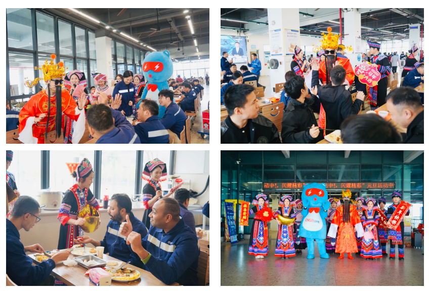 基地形象大使團也迎來了“驚艷首秀”。他們與活潑可愛的“鋰電寶寶”、喜氣洋洋的“財神爺”共同集結,組成了一支活力滿滿的送福小分隊。在濃厚的節日氛圍中,這支“福氣天團”通過創意十足的互動與沉浸式文化體驗,正式拉開了基地辭舊迎新、共赴新篇的華麗序幕?!盎芋w驗巡游”環節點燃了全場最高熱情。員工們爭相與“財神爺”大力擊掌、擁抱“金元寶”,在響亮的掌聲中“掌”握新年好彩頭。“接福挑戰”更是一場智慧與默契的較量,大家妙語連珠,接力送出“一馬當先”的節日祝福。摩洛哥同事也深受感染,熱情加入其中,中外伙伴歡聚一堂,在歡聲笑語間繪就了一幅跨越國界的文化交融新春圖景。