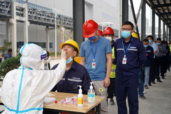 與此同時,基地嚴格要求進入廠區(qū)人員全天佩戴口罩、接受體溫檢測、兩碼核對,積極與政府部門對接,在公司設立核酸檢測點,每日組織全員核酸檢測工作,確保防疫、生產(chǎn)兩不誤。在這場沒有硝煙的疫情防控阻擊戰(zhàn)中,南部產(chǎn)業(yè)基地涌現(xiàn)出了一批奮戰(zhàn)在抗疫一線的“逆行者”,這支由公司黨員組成的志愿先鋒隊主動請纓,協(xié)助醫(yī)務人員完成核酸檢測信息錄入等相關(guān)工作。在9天的時間里,他們奮戰(zhàn)在核酸檢測一線,每天輔助核酸檢測4000余人/次,憑借積極主動、細致熱忱、調(diào)度高效的服務,得到了醫(yī)護人員和全體員工的一致稱贊。